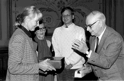 Pertti Virtaranta (oikealla) lahjoittamassa setukaistutkija Mare Piholle nauhuria kenttä-äänityksiä varten. Mukana olivat myös H. Laja ja T. Pitkänen.